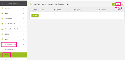 SAMLに対応したサービスとの連携であれば、Gluegent Gate の管理画面から左メニュー「シングルサインオン」>「SAML」から「登録」タブをクリックしていただき、SAMLの設定が可能となります。