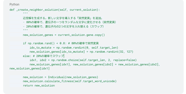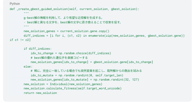 - 問題への適応: Swap演算子を導入したことで、蜂たちは無駄な探索をせず、意味のある文字列の組み合わせを探せるようになりました。これは、アルゴリズムを解きたい問題の性質に合わせることの重要性を示しています。