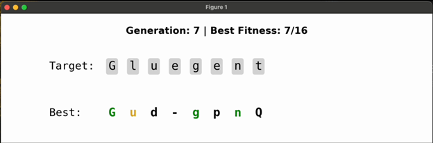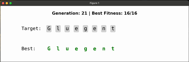 print(f"Generation {i+1}: Best Fitness = {self.best_solution.fitness}/{max_possible_fitness}, Best Word = {current_best_word}")