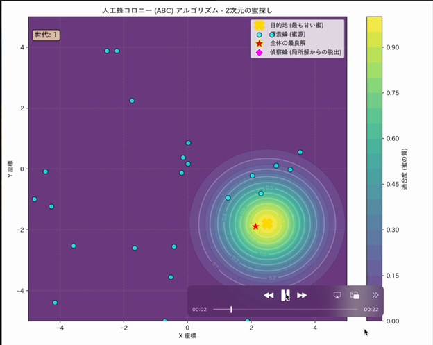 世代が進むにつれて、青い点が山の頂上(黄色い×印)に集まっていく様子や、時々ピンクの偵察蜂が全く違う場所に出現する様子が見られるはずです。