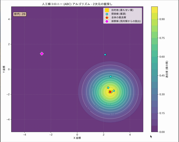 - 偵察蜂 (Scout Bees): 担当していた蜜源が枯渇(解が改善しない)した場合、その場所を捨てて全く新しい蜜源を探しに行く蜂。