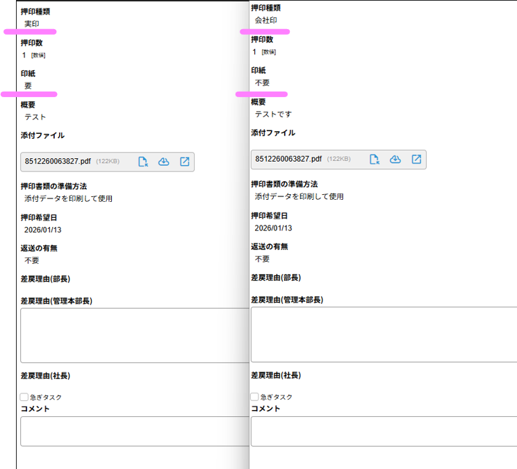 押印種類の選択による画面変化の比較