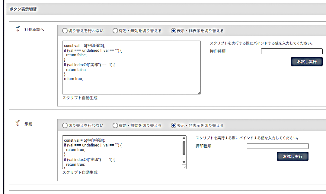 アド・ウォーク様では、押印申請において「実印」が選択された場合のみ、自動的に「社長承認」のボタンが表示されるスクリプトを活用しています(画像上)。