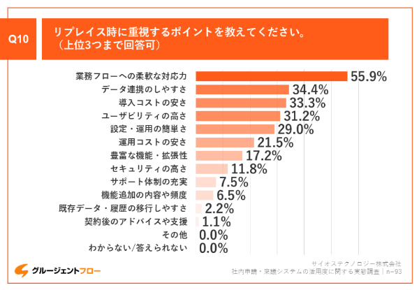 Q9.で「積極的に検討している」「やや検討している」と回答した方に、「Q10.リプレイス時に重視するポイントを教えてください。(上位3つまで回答可)」(n=93)と質問したところ、「業務フローへの柔軟な対応力」が55.9%、「データ連携のしやすさ」が34.4%、「導入コストの安さ」が33.3%という回答となりました。