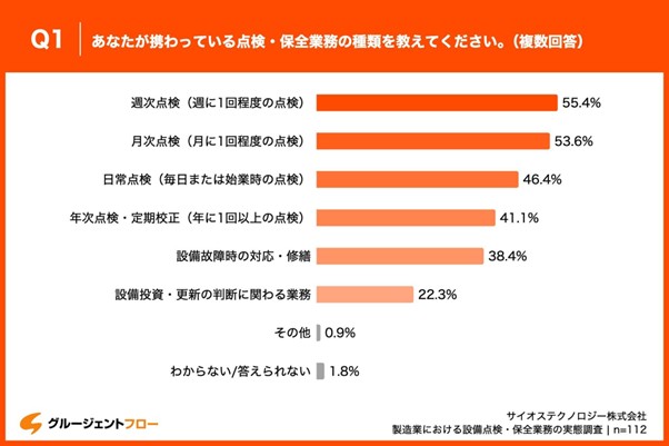 「Q1.あなたが携わっている点検・保全業務の種類を教えてください。(複数回答)」と質問したところ、「週次点検(週に1回程度の点検)」が55.4%、「月次点検(月に1回程度の点検)」が53.6%、「日常点検(毎日または始業時の点検)」が46.4%という回答となりました。