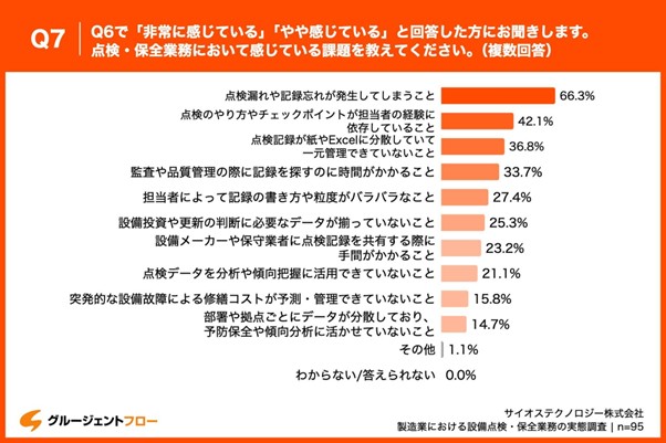 「Q7.Q6で「非常に感じている」「やや感じている」と回答した方にお聞きします。点検・保全業務において感じている課題を教えてください。(複数回答)」と質問したところ、「点検漏れや記録忘れが発生してしまうこと」が66.3%、「点検のやり方やチェックポイントが担当者の経験に依存していること」が42.1%、「点検記録が紙やExcelに分散していて一元管理できていないこと」が36.8%という回答となりました。