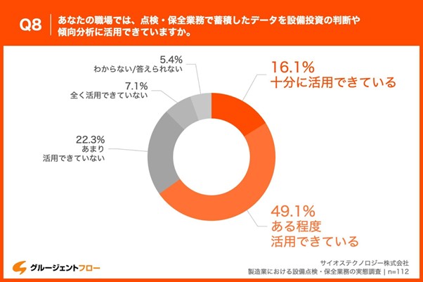 「Q8.あなたの職場では、点検・保全業務で蓄積したデータを設備投資の判断や傾向分析に活用できていますか。」と質問したところ、「十分に活用できている」が16.1%、「ある程度活用できている」が49.1%という回答となりました。
