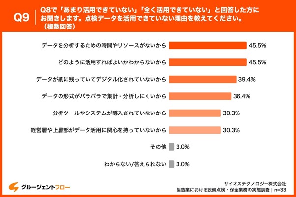 「Q9.Q8で「あまり活用できていない」「全く活用できていない」と回答した方にお聞きします。点検データを活用できていない理由を教えてください。(複数回答)」と質問したところ、「データを分析するための時間やリソースがないから」が45.5%、「どのように活用すればよいかわからないから」が45.5%、「データが紙に残っていてデジタル化されていないから」が39.4%という回答となりました。