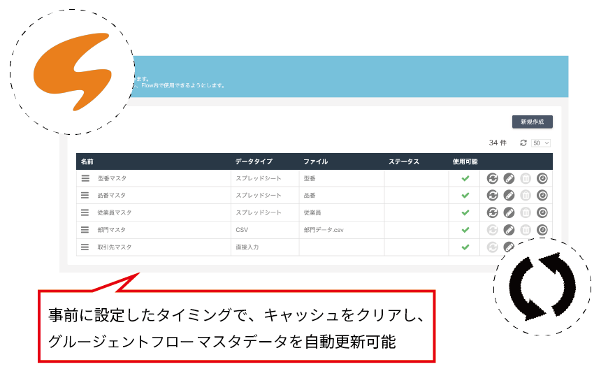 マスターデータ登録は、ExcelやGoogleスプレッドシート、CSVで行えます。登録されたマスターデータは、申請フォームの選択項目として活用でき、商品マスタ、備品マスタ、勘定科目マスタ等、様々なマスターデータを登録でき、利用者の利便性を高めます。さらに管理者は「自動的にリフレッシュする」等追加設定でき、利用者への影響を気にせず、マスターデータを更新できます。