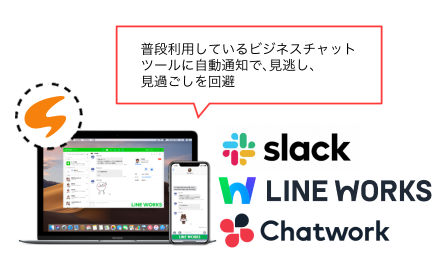 社内で普段利用しているビジネスコミュニケーションツールへ、確認や承認依頼などの自動通知を行うことができます。LINE WORKS、Slack(ベータ版)、Chatwork(ベータ版)など、ご希望のビジネスチャットツールとそれぞれ連携設定をすれば、すぐにご利用いただけます。