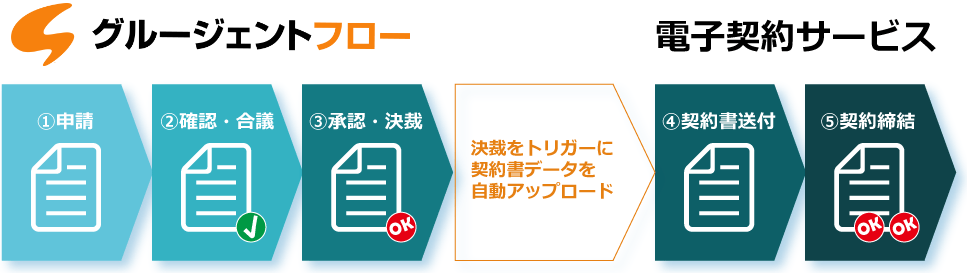 グルージェントフローは電子契約システムなどと連携。決裁内容や添付ファイルをシームレスに連携します。申請者の入力負担と管理部門の二重管理の手間を大幅に削減します。 |