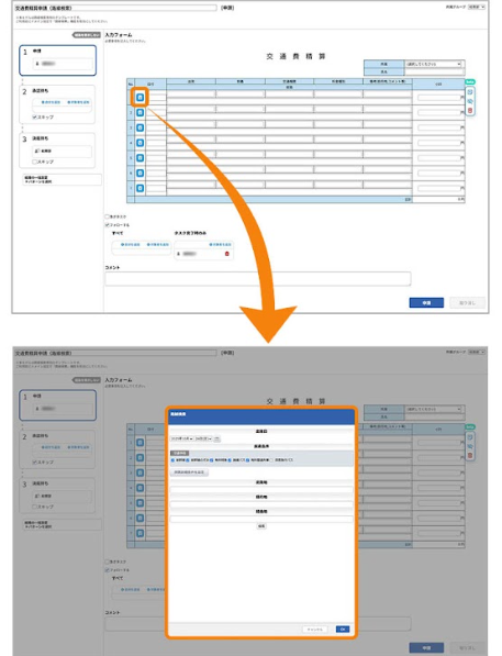 - 利用路線と交通費をポップアップ画面に入力するだけで、帳票に自動反映。
