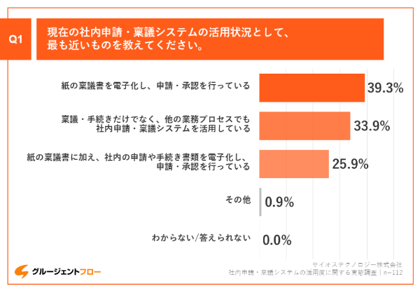 「Q1.現在の社内申請・稟議システムの活用状況として、最も近いものを教えてください。」(n=112)と質問したところ、「紙の稟議書を電子化し、申請・承認を行っている」が39.3%、「稟議・手続きだけでなく、他の業務プロセスでも社内申請・稟議システムを活用している」が33.9%、「紙の稟議書に加え、社内の申請や手続き書類を電子化し、申請・承認を行っている」が25.9%という回答となりました。