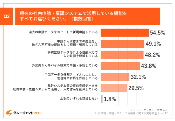 「Q2.現在の社内申請・稟議システムで活用している機能をすべてお選びください。(複数回答)」(n=112)と質問したところ、「過去の申請データをコピーして新規申請している」が54.5%、「申請から承認までの履歴を、改ざん不可能な証跡として記録・管理している」が49.1%、「事前登録データ等による自動入力で入力負荷を軽減している」が48.2%という回答となりました。