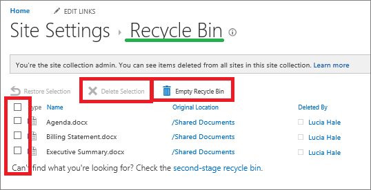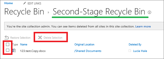 - ファイルを削除した後、サイトのごみ箱(第1段階のごみ箱)を開き、そこからもファイルを削除する必要があります。