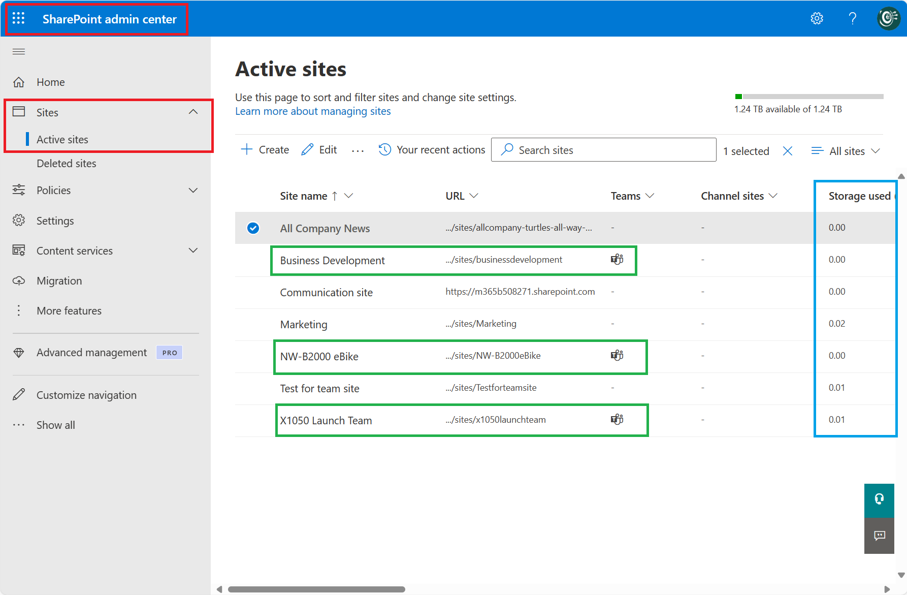 - この一覧のストレージ列で、各チームサイト(=Teamsの裏側)が現在使用している容量(ギガバイト単位)を確認できます。