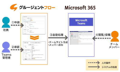 具体的には、グルージェントフロー でTeams の「チームサイト」の利用に関する申請を実施することで、申請データを自動処理によって「チームサイト」の設定を変更することが可能となります。