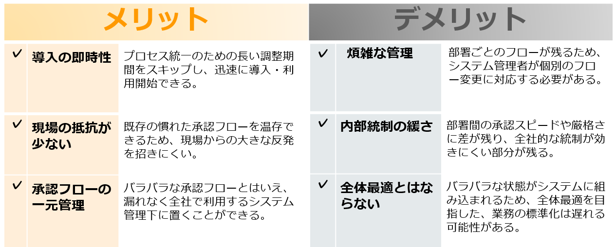 システムの柔軟性を活用し、バラバラなフローを許容。管理下におけるが、業務標準化は一歩一歩の対応となる。 |