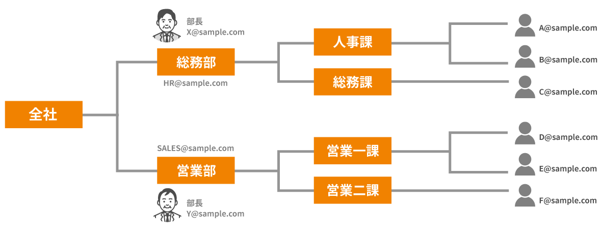 1つのグループを1つの「部署」、グループに所属するメンバーを「部署の構成員」として解釈します。この階層構造の構成を、組織ツリーといいます。