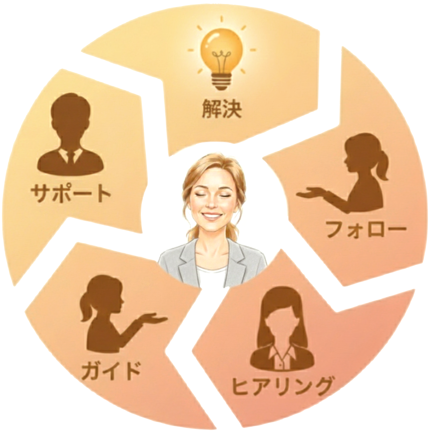 お客様に伴走するのは、数々の課題に向き合ってきたプロフェッショナルチームです。サービス提供開始時期から現在に至るまで、サポート一筋のプロフェッショナルや、初期設定のエキスパートなどが、お客様をご支援します。 各サポートメンバーは、「伴走」サポートの方針に則り、お客様に寄り添い「フォロー」「ヒアリング」「ガイド」「サポート」します。 お客様の状況や立場に寄り添い、お話をじっくりお伺いし、解決策をご提示しながら、ご支援します。また、サポートチームがお客様とともに蓄積したナレッジやノウハウは、お客様ご自身が自己解決する味方になります。 それら提供開始以来の他社利用例やナレッジが、お客様をお支えします。