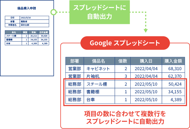 - ひとつの申請から複数行のレコードを出力できるため、備品の種類ごとに個数や購入金額、購入日などの情報を台帳に書き出せます